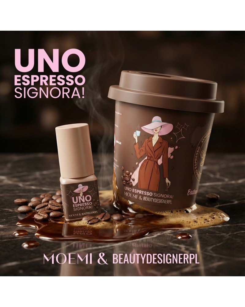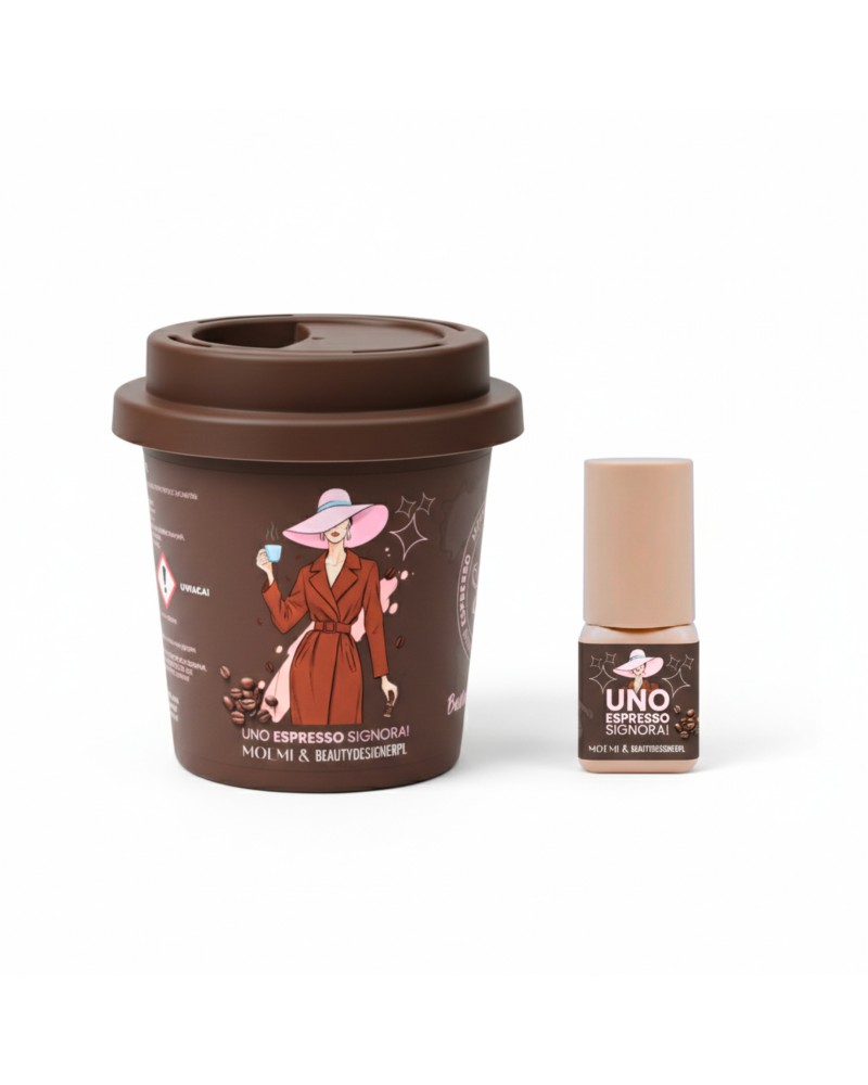 Moemi Uno Espresso to wysokiej jakości brązowy klej o błyskawicznym czasie wiązania 0,5 sekundy. Idealny do klientek, które preferują naturalny, ciepły efekt bez intensywnej czerni.
